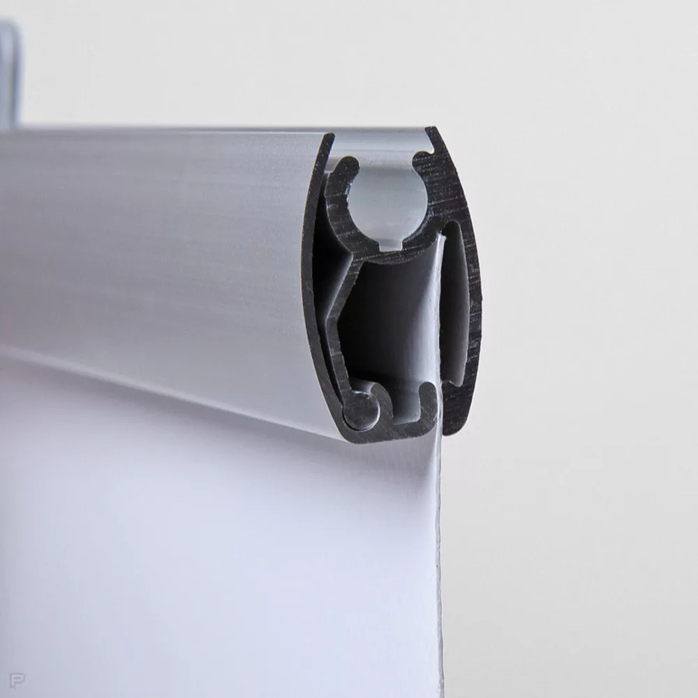 A rendszer eloxált alumínium csíptetős profilsínből áll, amely felül és alul rögzíti a grafikát.