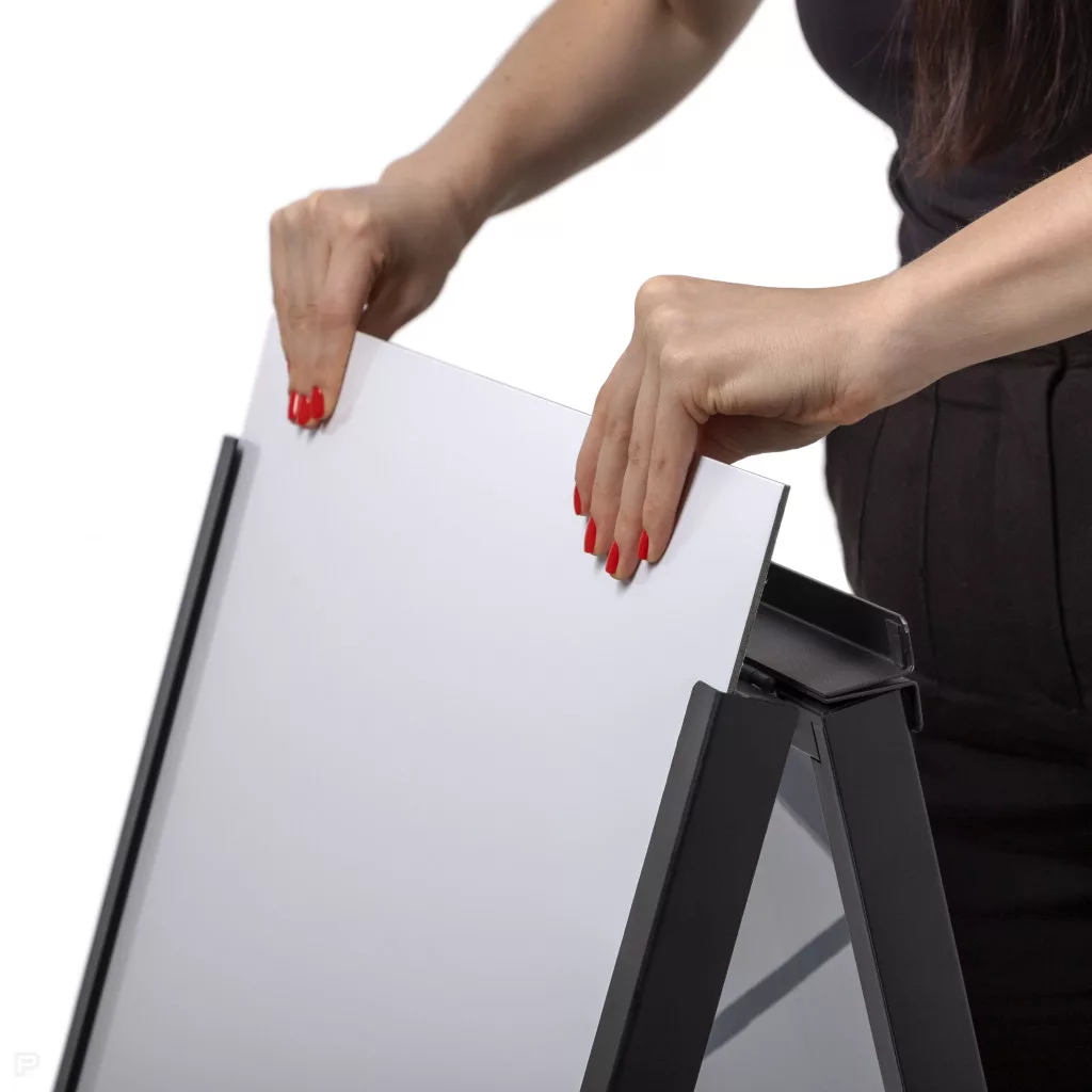 A felül nyitható keretnek köszönhetően a grafika felülről egyszerűen becsúsztatható, így a csere gyors és kényelmes.