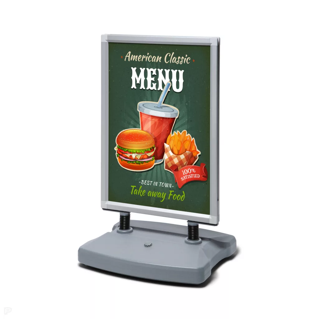 A rugós, szélkompenzált kialakításnak köszönhetően a tábla még erős szélben is stabil marad, miközben a kétoldalas reklámfelület minden irányból jól látható.