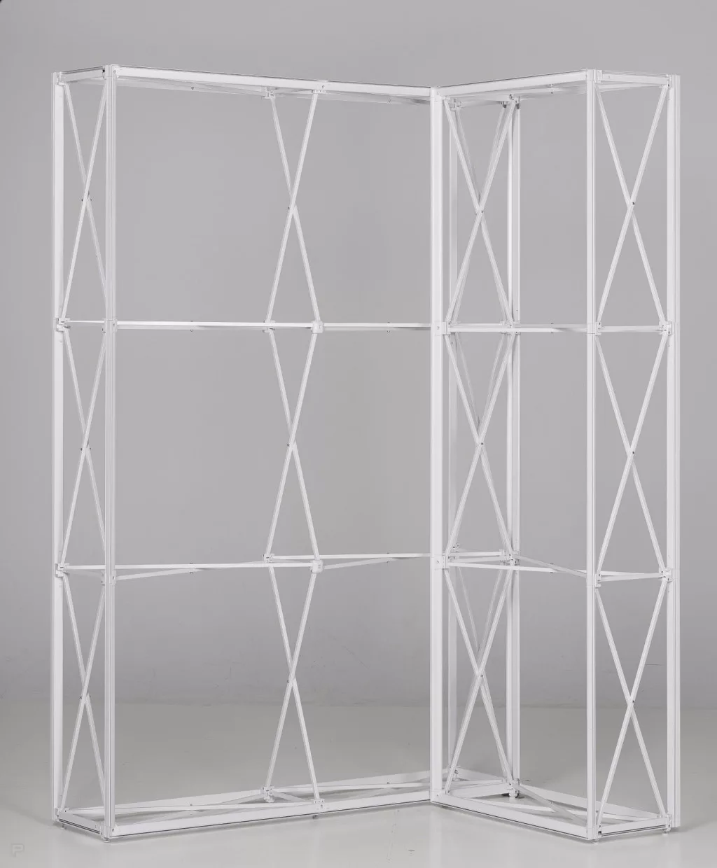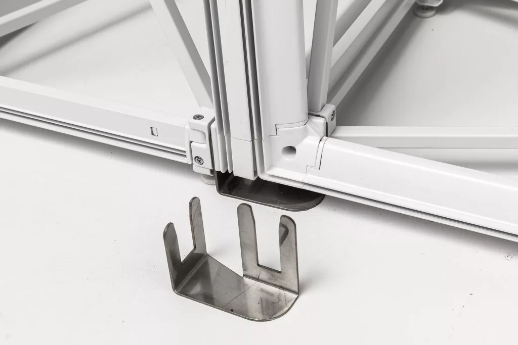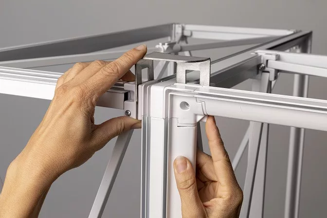 A pop-up textilfal sarokrögzítő elem (90°) lehetővé teszi, hogy két pop-up textilfalat derékszögben összekapcsolj, így látványos sarok megjelenítést alakíthatsz ki.