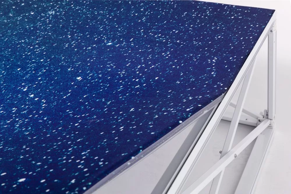 Ez a modern textil háttérfal a kategóriájában kiemelkedően stabil alumínium vázzal készül, amely harmonikaszerűen nyitható. A szerkezet gyorsan, szerszám nélkül felállítható, miközben kompakt méretre csukható, így könnyen szállítható.
