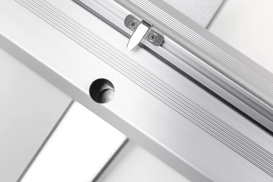 A felső sín erős csavaros rögzítéssel tartja a grafikát, így az mindig feszes és tartós marad, még nagy méret esetén is.