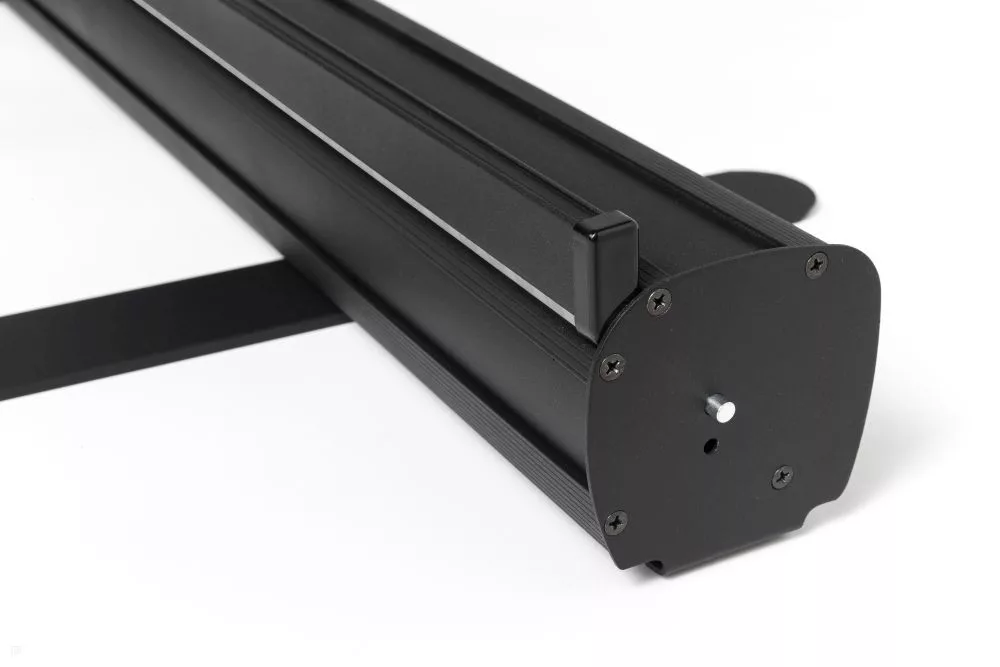 A masszív alumínium szerkezet stabil tartást ad, miközben könnyű marad, így egyszerűen szállítható és gyorsan felállítható. A grafika használaton kívül a kazettában védetten, feltekerve helyezkedik el, a rugós mechanika pedig gondoskodik a feszes megjelenésről.
