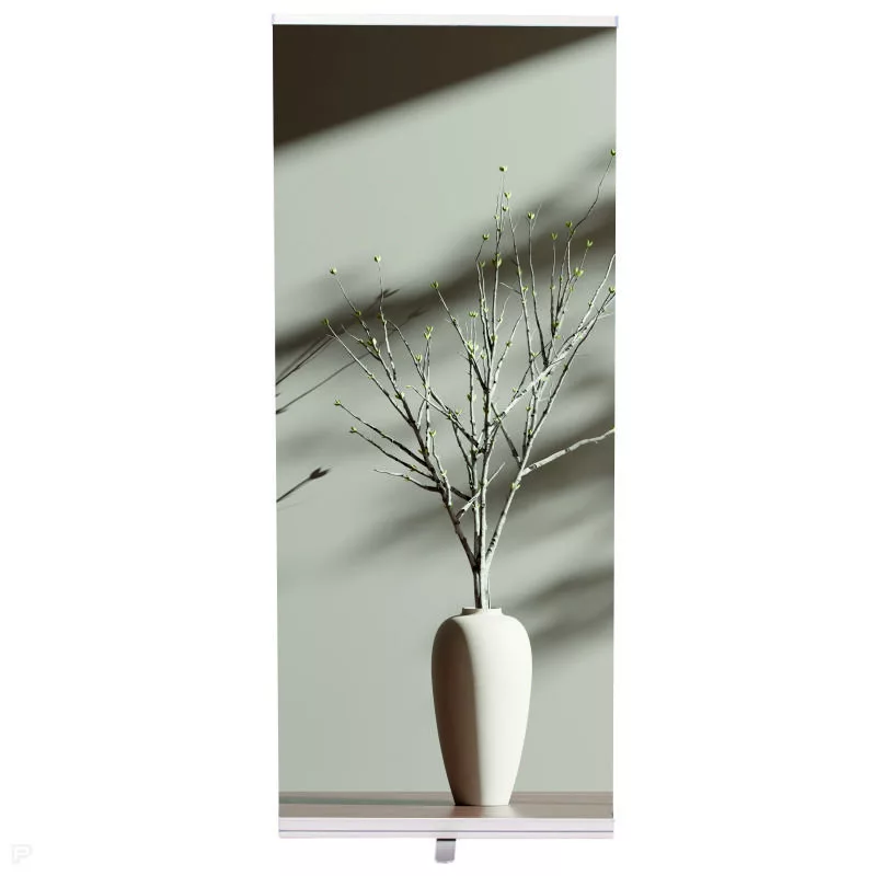 A roll-up egy rugós visszacsévélésű rendszerrel működik, ahol a nyomat egy belső tengelyre tekeredik fel. Használatkor egyszerűen kihúzható, majd a felső sínhez rögzíthető, így egy stabil, függőleges reklámfelületet kapsz.