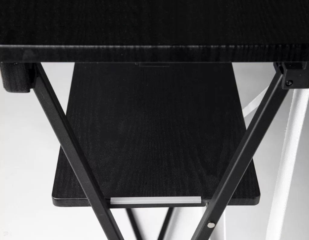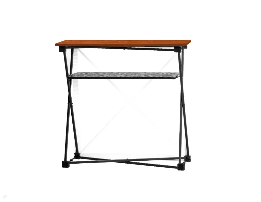 A pult összecsukható alumínium vázzal rendelkezik, tépőzáras grafika rögzítést használ, nyitott hátoldallal készül, és belső polccal rendelkezik.