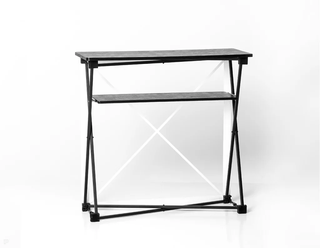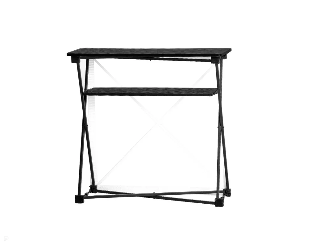 A pult összecsukható alumínium vázzal rendelkezik, tépőzáras grafika rögzítést használ, nyitott hátoldallal készül, és belső polccal rendelkezik.