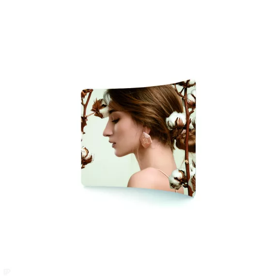Impozáns, ráfeszíthető textil huzattal ellátott háttérfal íves formában. Gyorsan összeállítható, bélelt hordtáskában könnyen szállítható.