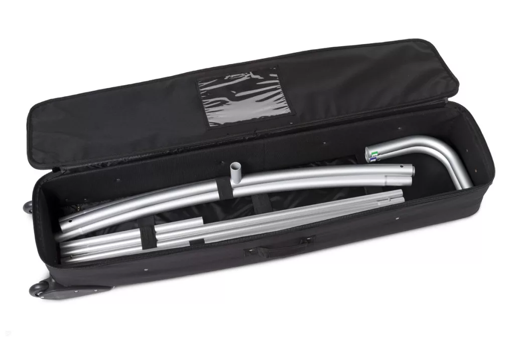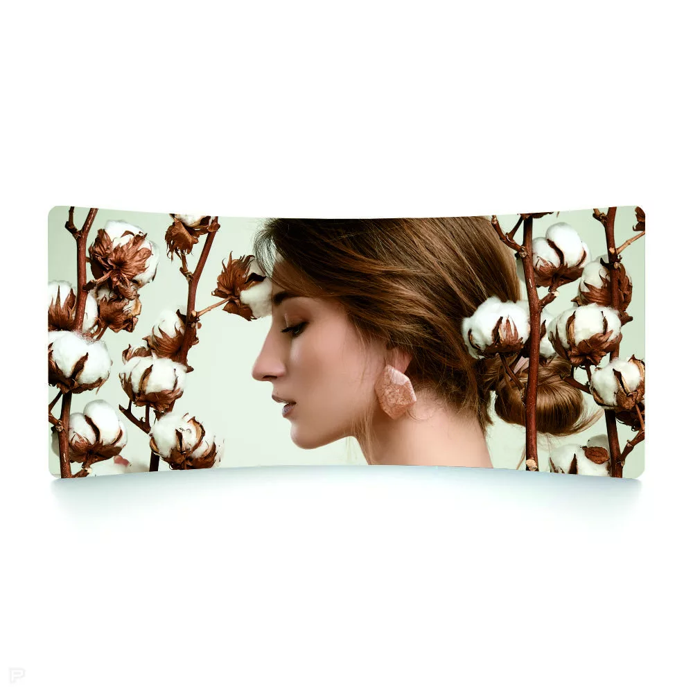 Impozáns, ráfeszíthető textil huzattal ellátott háttérfal íves formában. Gyorsan összeállítható, bélelt hordtáskában könnyen szállítható.