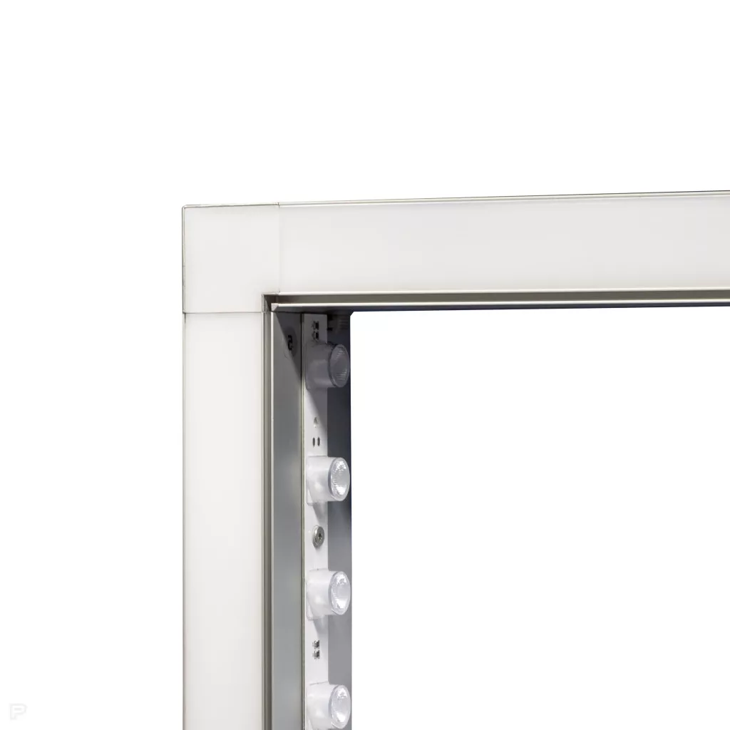 A rendszer 80 mm vastag alumínium profilból készül, ezüst színű kerettel, központi LED világítással és RGB élfénnyel.