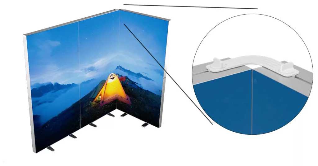 A világító textilfal sarok rögzítő elem egy praktikus és esztétikus megoldás több fal összekapcsolására.